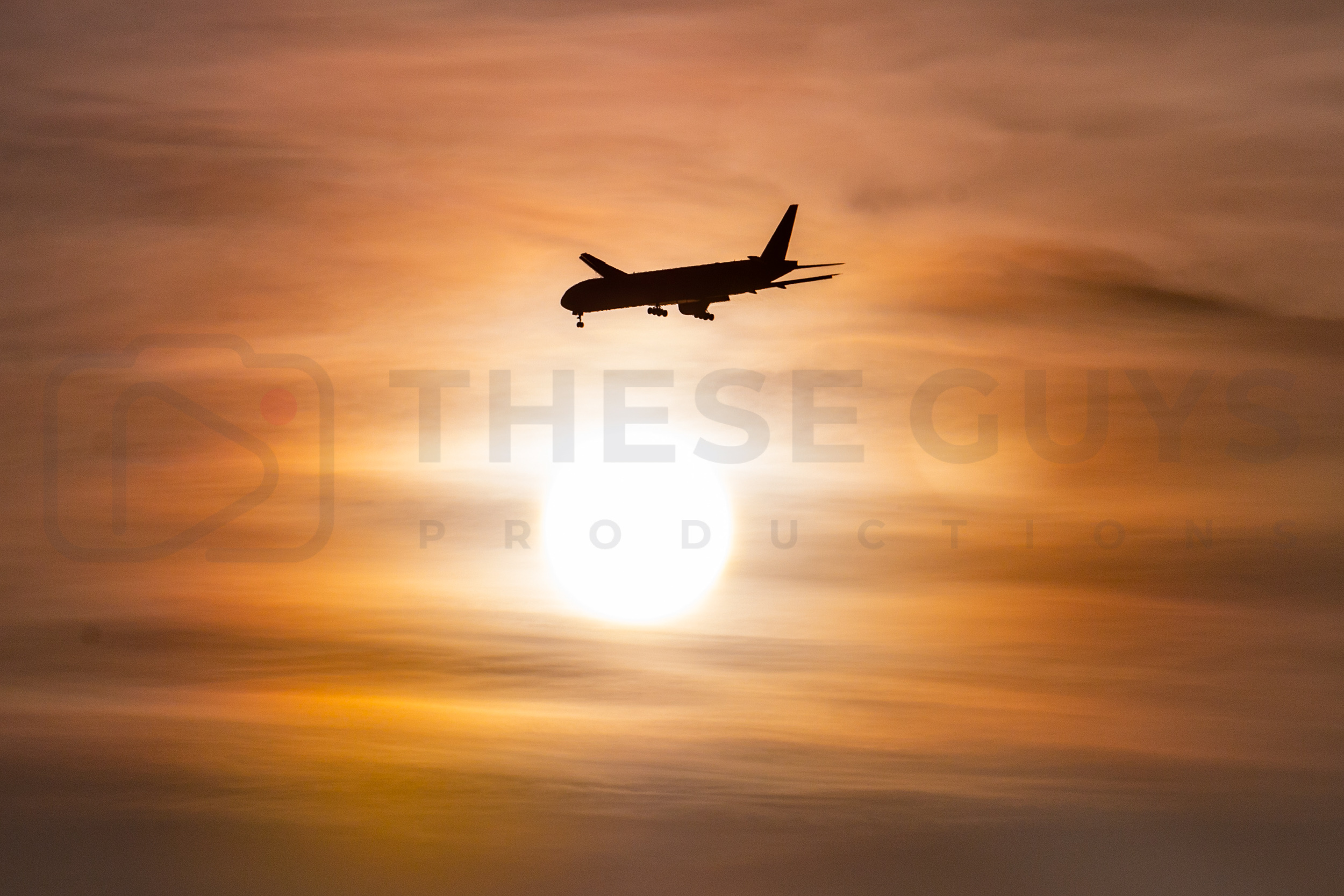 A commercial passenger jet flies past the sun during golden hour above Sunny Bay, Lantau.